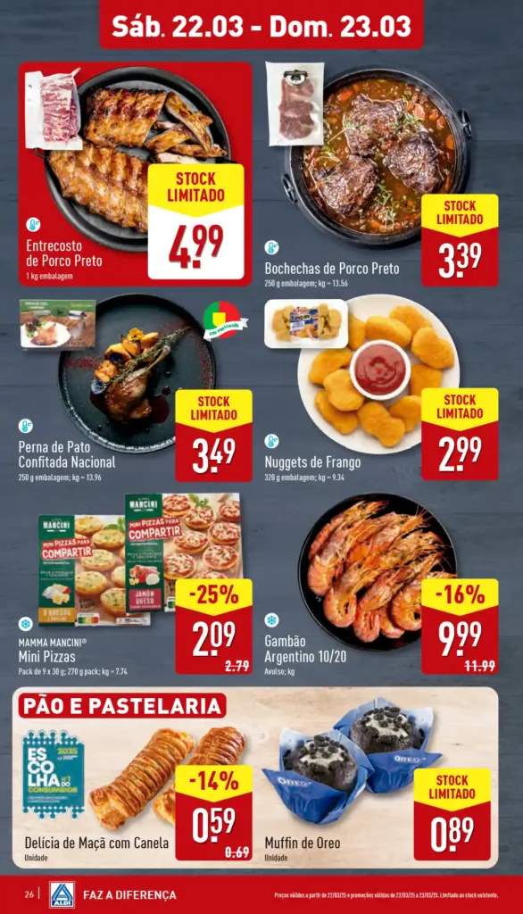 No folheto do Aldi da semana de 19 a 25 de março destacam-se a cerveja Pilsener da Wolters por 0,79€, o queijo dos Açores Milhafre a 1,98€, e o vinho branco DOC Reserva da região do Douro Planalto por 3,99€. O leite pasteurizado meio-gordo está a 0,99€, e as batatas fritas originais da Lays a 1,29€.